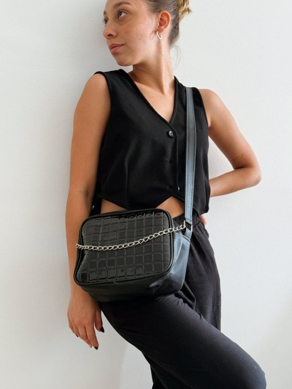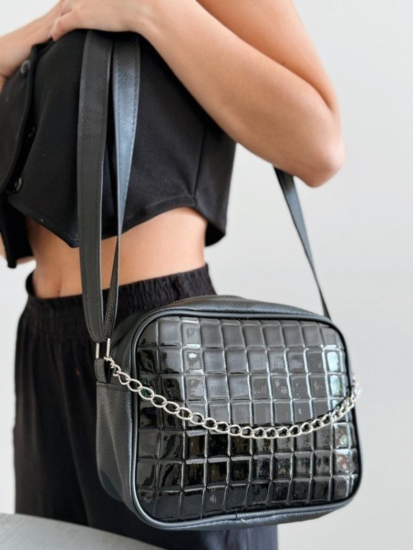 Diseño combinado en cuero liso y textura de charol, mas detalle de cadena.